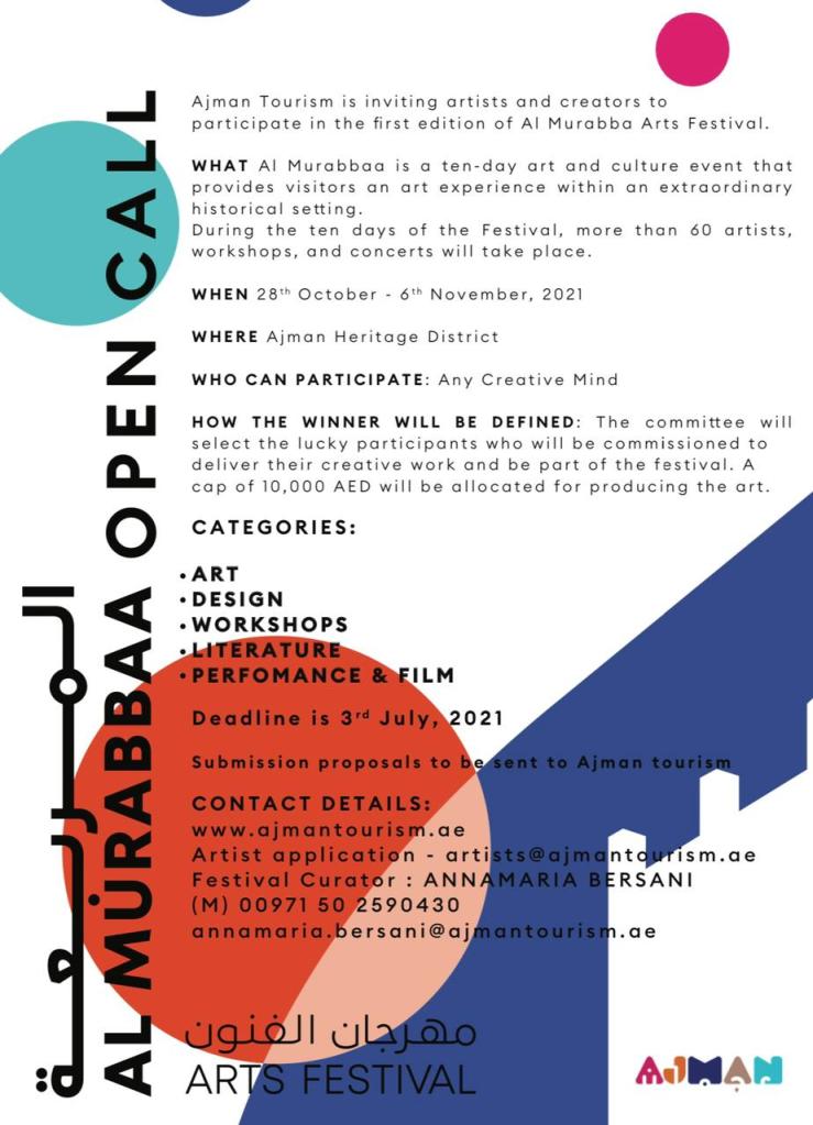 Creators! Don’t miss this chance to be a part of the inaugural Al Murabbaa Arts Festival in Ajman! Submit your proposal by July 3rd for the opportunity to have your work showcased or to be a part of an enriching event.